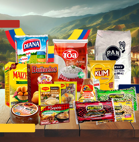 Llena tus anaqueles con lo mejor de nuestra tierra. Productos esenciales para cualquier hogar colombiano en el extranjero: Arroz Diana, Frijol Maritza Rojo, La Sopera Ajiaco, Maggi Sopa Sancocho, Panela Don Panelo, Arroz Roa y otros.